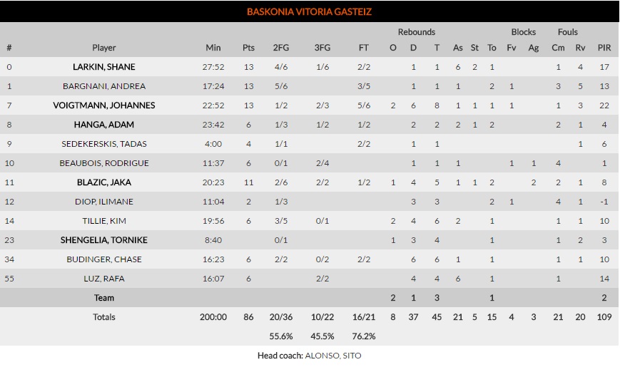 El último período fue un mero trámite. El Buesa Arena disfrutaba de los suyos y los jugadores volaban sobre la pista. No hay mucho que destacar, a excepción de las bonitas acciones que dejaron, como el alley-oop entre Larkin y Budinger; o los minutos de los menos habituales (Tadas anotó 4 puntos y Kim Tillie, que no había estado muy bien hasta ahora, fue adaptándose al ritmo del equipo). La diferencia se disparó hasta más de los 30 puntos y el resultado último fue de 86-52. La valoración, sonrojante: 109-36. El dominio en el rebote (45-35) y otros apartados estadísticos fue bastante claro (21 asistencias por 10 turcas).