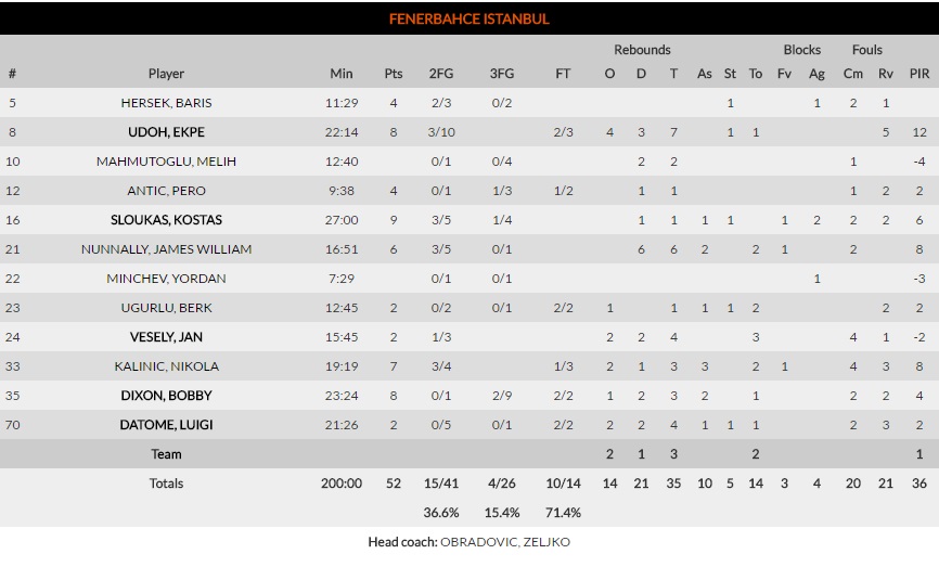Voigtmann y Larkin, los mejores con 13 puntos cada uno; sumando 8 rebotes y 6 asistencias respectivamente. Bargnani también alcanzó esa cifra de puntos, pero en instantes de mayor relajación. Nadie en Fenerbahçe alcanzó los 10 puntos anotados. Fiel reflejo de la superioridad de un equipo sobre otro. La intensidad, por otro lado, fue lo más destacado. Gran defensa local, sumado a un horrible partido de los de Obradovic en los porcentajes (15% en tiros de tres).