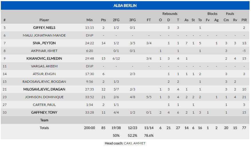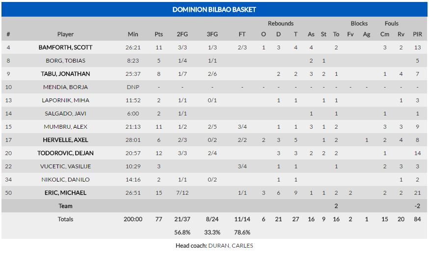 Era entonces cuando aparecía Peyton Siva, el base del equipo alemán hasta ese momento había estado más o menos desaparecido, pero cuando todo estaba por jugarse comenzó a tomar responsabilidades; atacaba constantemente a Javi Salgado, que era incapaz de frenar sus cambios de ritmo. El encuentro entraba en una fase de intercambio de golpes del que salía reforzada la confianza del Alba de Berlín. Solo la contundencia de Michael Eric, el mejor de los locales hoy, permitía seguir vivo al Bilbao Basket. Sin embargo, bajo la batuta de Siva los alemanes conseguían ventajas constantemente, y gracias a su acierto en el triple y a los problemas para frenar al base americano, conseguían el control del ritmo de juego. Dominion Bilbao Basket lo intentaba hasta el final, pero un balón que se escurría de las manos de Eric, acababa en una clara antideportiva del center bilbaíno, y terminaba de decantar el encuentro amargando el debut europeo del equipo de Carles Duran, que sumaba su primera derrota de la temporada. Al final, victoria alemana por 77-85.