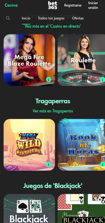 Bet365 ofrece también casino a través de juegos tragaperras, póker, blackjack, ruleta, y ruleta en vivo. Más de 1.100 slots y 20 de juegos de mesa componen su catálogo de títulos entre los que no faltan productos de proveedores como Microgaming, Blueprint Gaming, Netent, Pragmatic Pla o MGA.