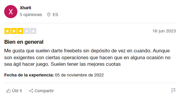 Aún así, se echa en falta una mayor presencia de juegos de casino en vivo y una oferta recurrente de bonos. Le damos una calificación de 4,5/5 porque su página es muy sencilla de usar y su oferta deportiva es amplia pero necesita mejorar su catálogo de juegos de casino, ofrecer más opciones de casino en vivo y promociones para gratificar a sus jugadores. Además, no cuenta con un club de fidelización.