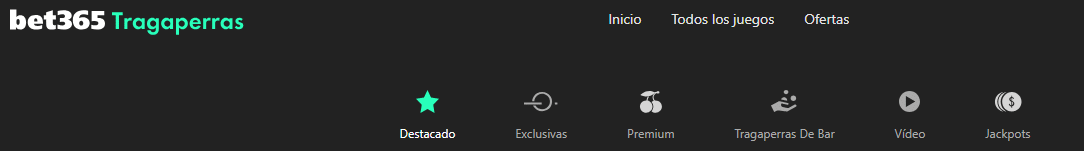 En Bet365 España verás diferentes tipos de tragaperras, como son las: Exclusivas, Tragaperras de bar, Premium, de Video y de Jackpot. En total son cinco modalidades diferentes que te ofrecen una experiencia de juego mucho más completa. Las encontrarás en los subtítulos de la sección, tales como ‘Todos los juegos’.