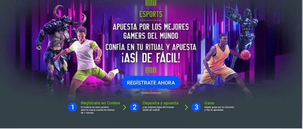 Codere se ha dado a la tarea de reunir los juegos más populares en e-sports, como League of Legends (LoL), Counter-Strike: Global Offensive (CS: CO), Dota 2, Overwatch, EAFC 24 y Rainbow Six siege. Cuenta con los torneos más relevantes para apostar por los mejores gamers del mundo, tales como: The international, campeonato de Dota 2; el campeonato mundial de Counter-Strike: Global Offensive, el campeonato mundial de Fortnite y la Overwatch League Grand Finals.