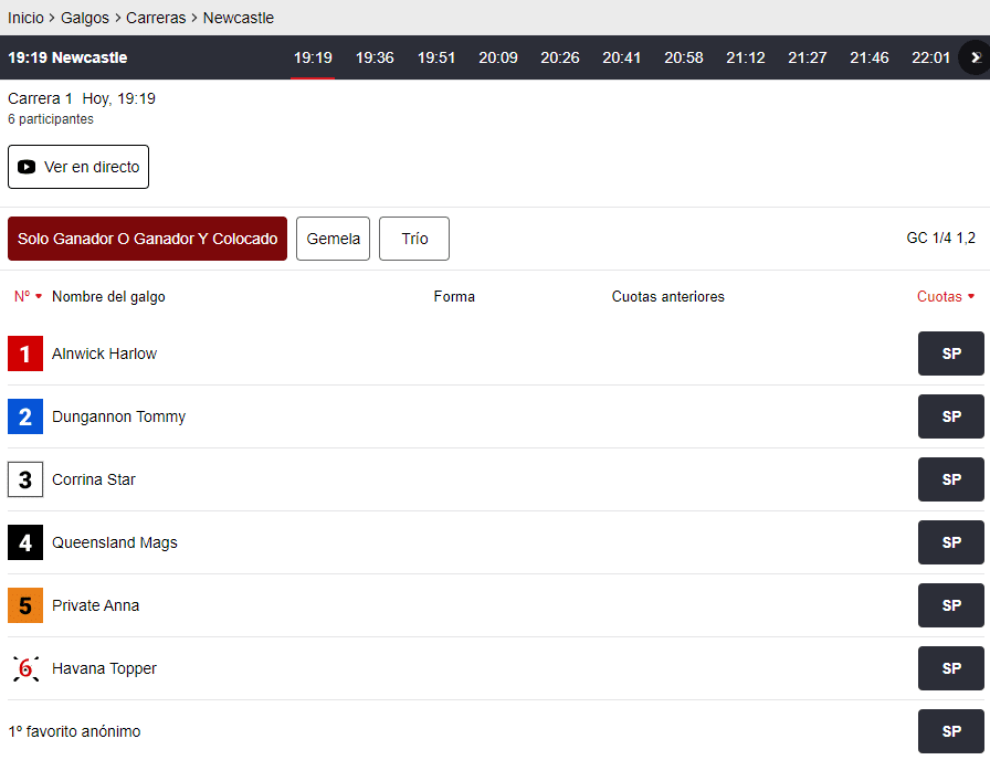 Para usar el servicio en vivo, deberás entrar en la sección de carreras de galgos. Esta se ubica en la sección deportiva, por lo que tendrás acceso fácil desde el menú del sitio. Una vez dentro, verás las diferentes opciones de apuestas, incluyendo las que son en vivo. Estas contarán con una flecha a un lado, para que puedas diferenciarlas del resto.