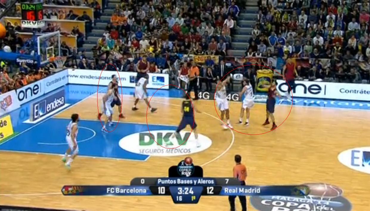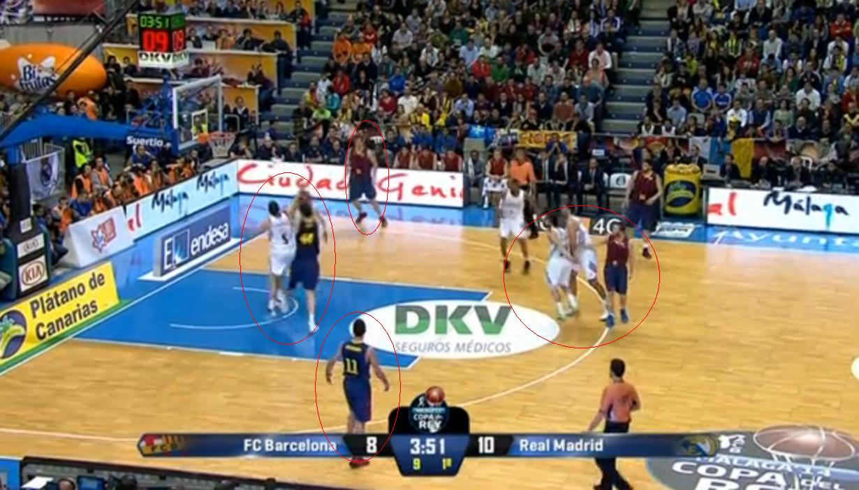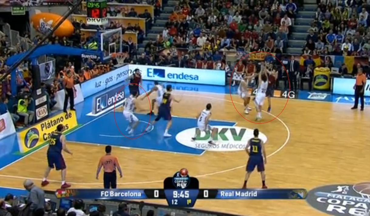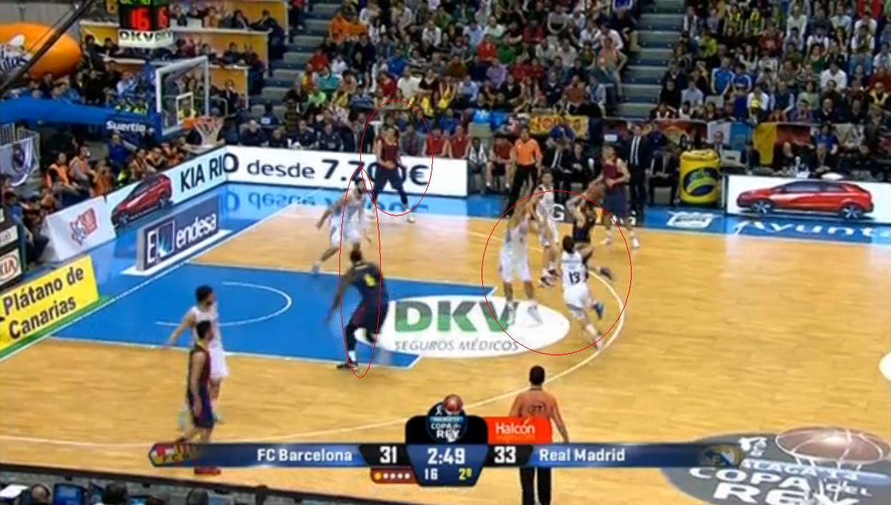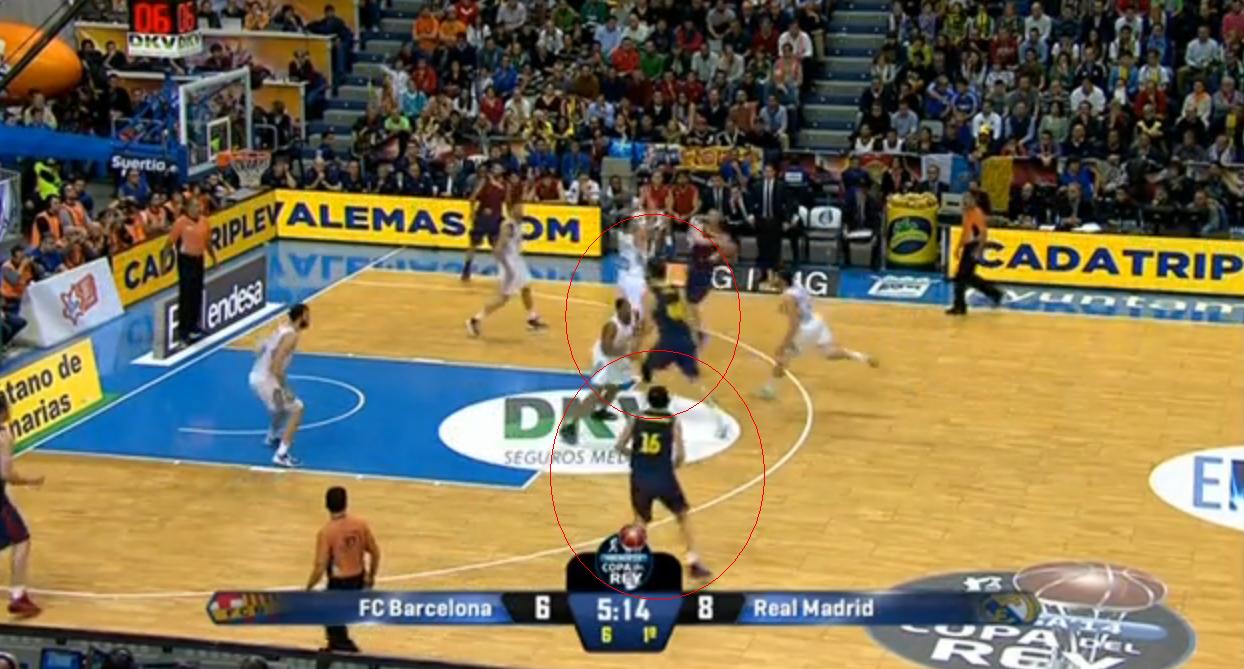Analizaremos las situaciones que se jugaron en la final comenzando por el ataque azulgrana de la primera mitad que acabó con ventaja para el Barça de cuatro puntos 38-42. Aunque bien es cierto que se abusó del pick and roll central hubo muchos matices de la colocación de los otros jugadores que impidió al Real Madrid defender con garantías esta situación. Marcelinho Huertas y su capacidad para pasar en el aire dando tiempo a que se produjese el desbloqueo interior tuvo mucha culpa de la facilidad de anotar del Barça en el primer acto. Tener las ideas muy claras de qué iban a jugar también.