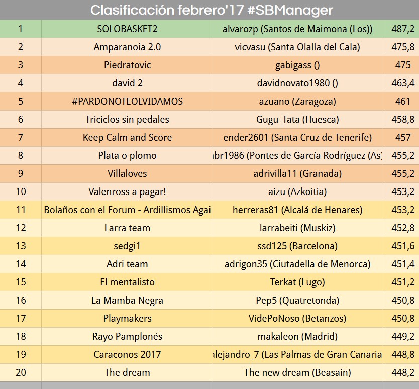 La actualidad de la Copa manda esta semana pero no nos olvidamos de la Liga. La clasificación de Febrero está comandada por Alvarozp, que tiene muchas opciones de ser el primero en repetir premio mensual de nuestra liga privada. El mánager de los Santos de Maimona está intratable en los últimos meses. Ha conseguido arrebatar el primer puesto de la general de todo el SM a Fanloman y en la general de nuestra liga privada se encuentra a tres puntos con su equipo SOLOBASKET2 que está tercero en la general. La intensa lucha entre dos de los mejores mánageres del SM promete emociones fuertes hasta el final, tanto en nuestra liga privada como en la lucha por coronarse ganador total del juego.