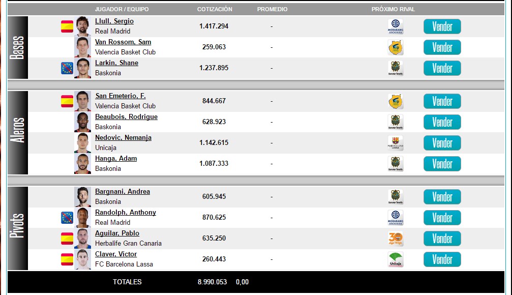 Opción 1: Equipo Solobasket. Apuesto fuerte por aleros. Al margen de los tres fijos, entra Nedovic, que después de verlo contra el Real Madrid me parece que está muy fino y no veo a nadie en el Barça capaz de pararle. En los pívots busco la sorpresa de jugadores irregulares: Bargnani si le entran los triples y tiene ganas puede hacer 20, si no se va a -4; a Randolph le veo valorando bien; Aguilar no me gusta pero no hay nada mejor en banderitas y viene de hacer 2 jornadas buenas; y Claver es fijo por precio y banderita.