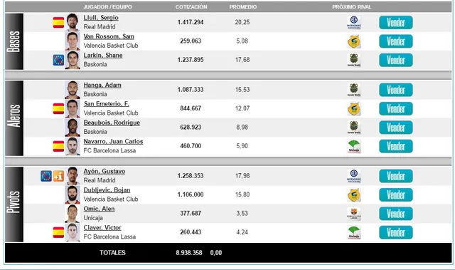 Opción 2: Equipo Fanloman Copa. En esta caso apuesto más por los pívots. Aquí meto a Navarro, que en torneos importantes suele estar más o menos bien y su experiencia puede ser valiosa. Con él, juego a la sorpresa de que le entren 4 triples y valore decentemente, aunque reconozco que, viendo lo mal que está, es improbable que lo haga. Por precio y bandera no veo nada mejor, quizás Eriksson esté en mejor forma pero dudo que juegue minutos (para jugar contra Manresa vale, pero no lo veo jugando contra Unicaja). En pívots, Ayón y Dubljevic aseguran regularidad, Omic no hará nada del otro mundo pero por 377.000 te puede dar 8-10, y Claver es fijo por precio y banderita.