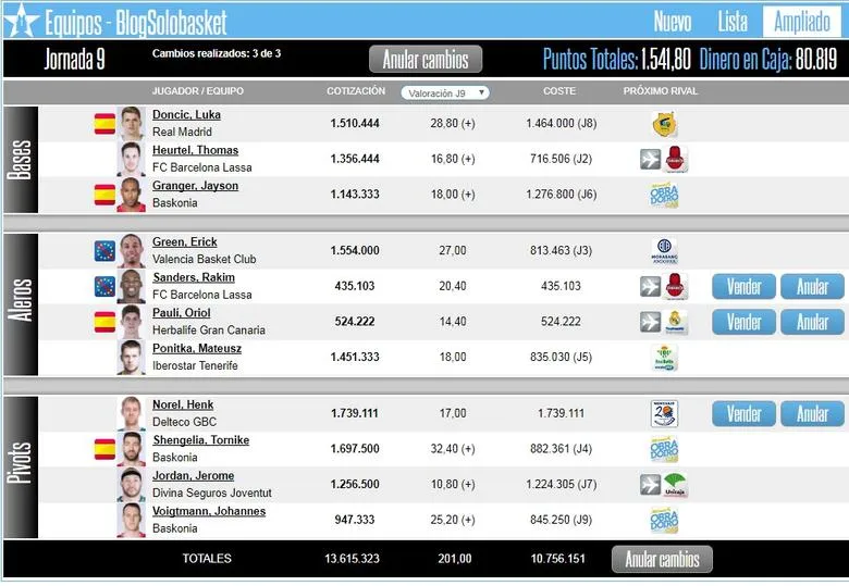 - Luka Doncic (Real Madrid)-Cupo: 1.510.444. Rival: Herbalife Gran Canaria. Motivos: Indiscutible. Broker: 53,94/21,58/-10,79