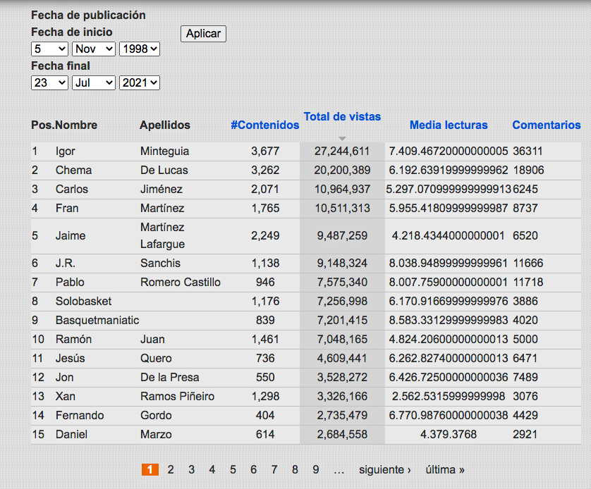 El próximo 5 de noviembre de 2021 cumpliremos 23 años. No os engañaremos, cada vez es más complejo mantener una web de las características de Solobasket vivita y coleando. Sin embargo, hoy hemos venido a festejar, pues cientos de colaborador@s han pasado por nuestro administrador y queremos compartirlo con vosotr@s y ell@s mismos. Desde aquell@s que están en el TOP de visitas, número de contenidos o comentarios como Igor Minteguia, Chema de Lucas, Jacobo Rodríguez, Pablo Romero… hasta los que pasaron de forma testimonial por la web.