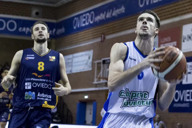 PRIMERA PARTE DE TANTEO Tanto Oviedo como Prat ofrecieron una primera parte llena de alternativas y buen juego de ataque, pero no tanto de defensa. Faltaba intensidad en el equipo local, lo cual aprovechaba el equipo potablava para, con buenas circulaciones de balón, terminar anotando canastas fáciles (58% en tiros de 2 en la primera parte). Pero su falta de acierto en el tiro de 3 (27.3%) y su poca capacidad para cerrar el rebote defensivo (10 ofensivos para los locales al descanso) les impedía irse con algo de renta al descanso (34-34).