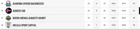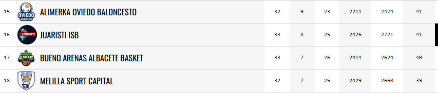 Con 41 puntos y 16º clasificado, es el primer equipo de la zona de descenso. Cierto es que tiene los mismos puntos que Oviedo, pero con una gran diferencia, y es que Juaristi ISB ya ha jugado su partido de esta jornada, tristemente con derrota en el resultado final 91 – 78 ante ICG Força Lleida. Por lo tanto, y con este resultado, el equipo de Mikel Odriozola no depende de sí mismo para salvarse, ya que debe ganar el partido de la última jornada, y esperar que Oviedo no gane niguno de los dos que le restan. Una situación más que complicada para intentar salvar la categoría, pero no imposible.
