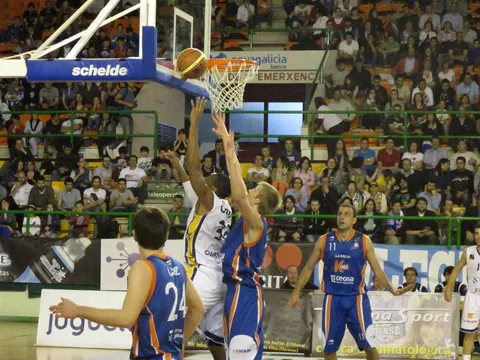 Los hombres de Peñarroya salieron dispuestos a recuperar el terreno perdido, y poco a poco lo consiguieron merced a sus dos principales figuras en ataque. Flis era un incordio constante bajo canasta, mientras que Dani Pérez asumía la responsabilidad por fuera. Con 28-27, el encuentro entraba en otro escenario completamente distinto. Pero la decoración del encuentro volvió a cambiar radicalmente debido a que los hombres de Antonio Herrera subieron un par de peldaños su intensidad defensiva, provocando las pérdidas de balón de su rival e iniciando rápidos contraataques. El resultado de todo esto fue un demoledor parcial de 15-1 a favor de los gallegos que ponía el 43-28 en el marcador, y que hacía presagiar un negro futuro a los andorranos en la eliminatoria. Los coruñeses conseguían anotar con fluidez y repartir el peso ofensivo entre todos sus hombres, consiguiendo mantener esta tónica hasta el final del primer tiempo (47-34).![]()