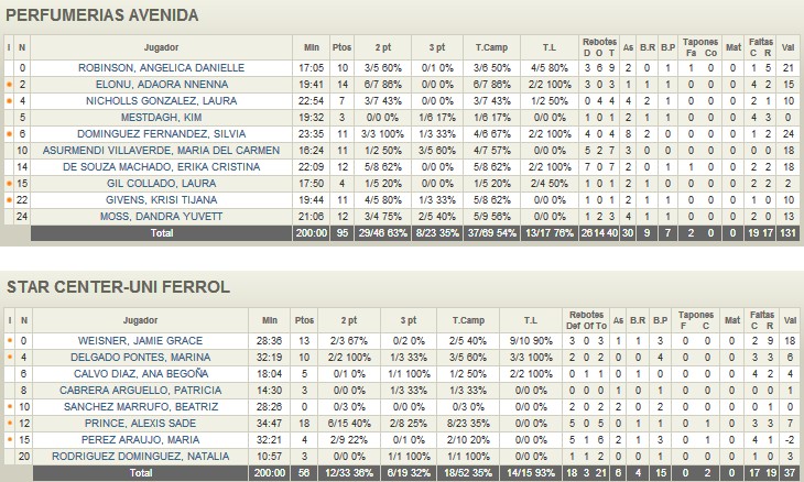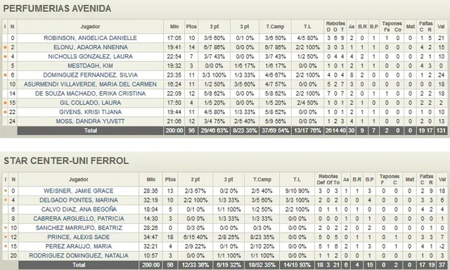 - Todas suman. El gran éxito de Miguel Ángel Ortega esta temporada radica en haber conseguido que todas sus jugadoras se sientan importantes y rindan al máximo en los minutos que permanezcan sobre el parqué. Muestra de ello es que 7 de los 10 efectivos del Perfumerías Avenida terminaron el partido en dobles dígitos en anotación. Un equipo en mayúsculas.