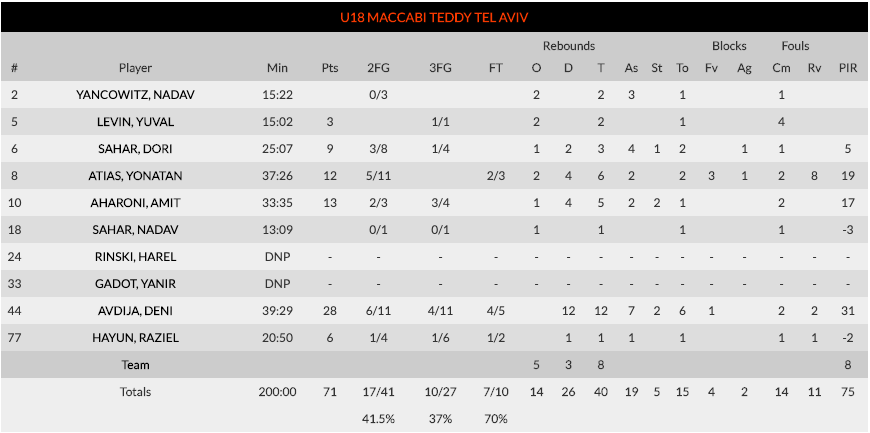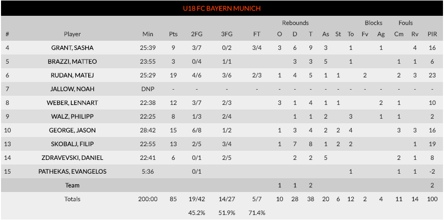 Nada más comenzar la jornada, un precioso duelo entre el FC Bayern Munich y Maccabi Teddy Tel Aviv bada comienzo a el último día de la competición antes de la final. Los alemanes liderados por Matej Rudan (19 puntos y 5 rebotes) supieron aprovechar las pequeñas ventajas para ir casi todo el partido por delante. Una vez más, Deni Avdija fue el jugador más destacado de su equipo con 31 puntos, 12 rebotes y 7 asistencias. Finaliza la competición promediando 24.7 puntos, 12 rebotes y 6.7 asistencias (+29.7 de valoración por partido y casi triple-doble).