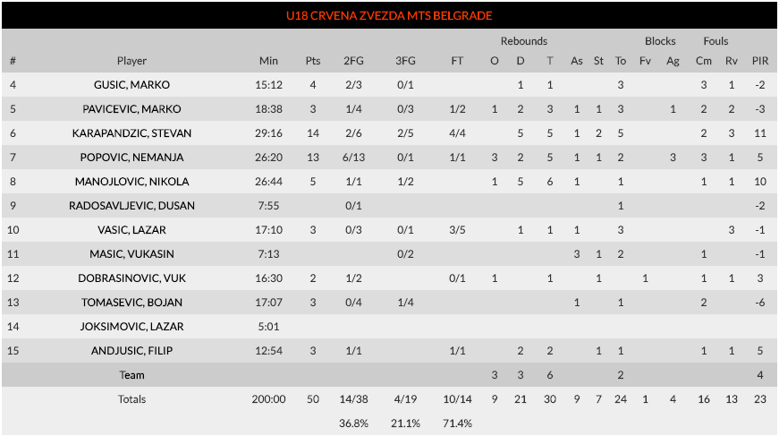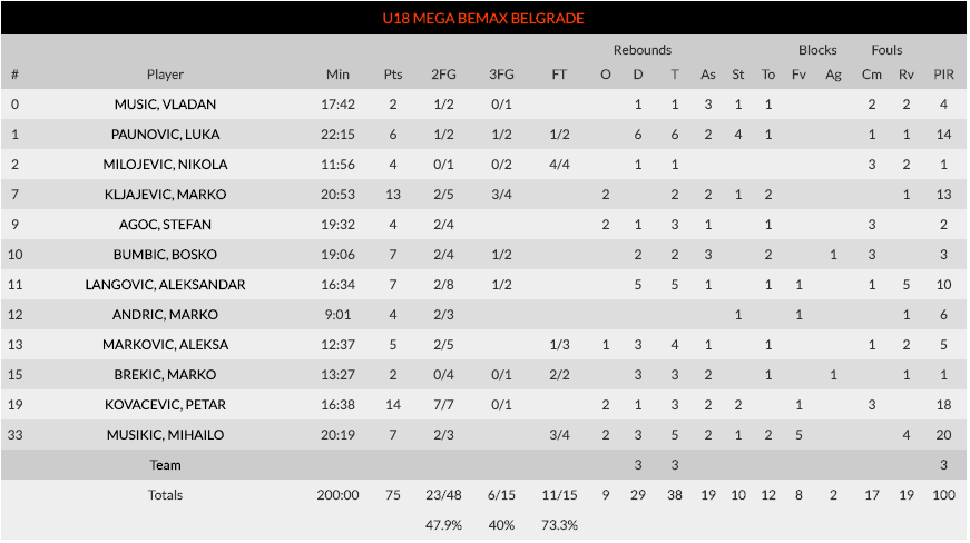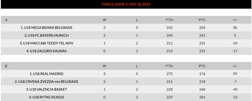 Cumpliendo con el objetivo, Mega Bemax Belgrade culminó la fase de grupos de forma invicta superado al Zalgiris Kaunas con el resultado de 75-61. Gracias a esta victoria, el equipo serbio certificó su pase a la final donde hasta ese momento, Real Madrid o Crvena Zvezda eran los candidatos a ocupar el otro puesto en la final. Mihailo Musikic fue el MVP con 7 puntos y 5 rebotes para el +20 de valoración.