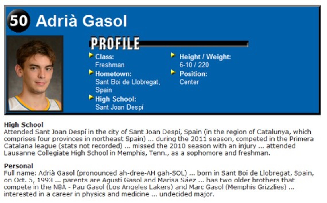 Adrià Gasol Sáez, pívot de 2,10 m y 19 años (05/10/1993) y natural de Sant Boi del Llobregat (Barcelona). Su periplo, siguiendo a sus padres y hermanos, ha estado siempre a caballo entre EEUU, donde juegan Pau y Marc, y Cataluña donde nació y vive su familia. Así, como Marc, empezó su formación baloncestística en el Lausanne Collegiate High School de Memphis entre 2009 y 2011 teniendo que superar una grave lesión en el año 2010. Más tarde, jugó la temporada 2011-12 en la 1ª catalana en las filas del Sant Joan Despí. De vuelta a los EEUU en la temporada 2012-13 estuvo en calidad de “walk-on” en UCLA. El suma y sigue le lleva de vuelta a su tierra. El destino para la temporada 2013-14 será el CB Santfeliuenc y el grupo C de EBA.