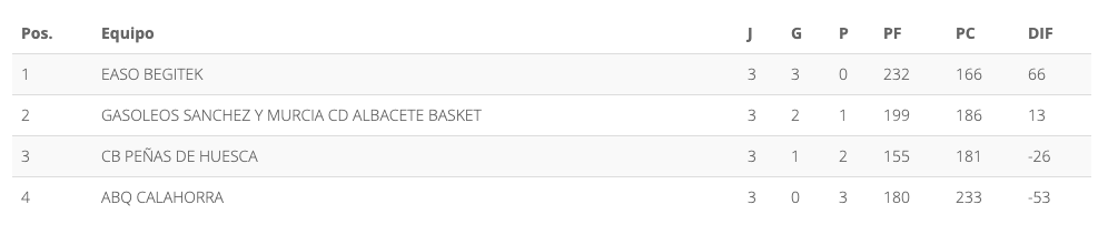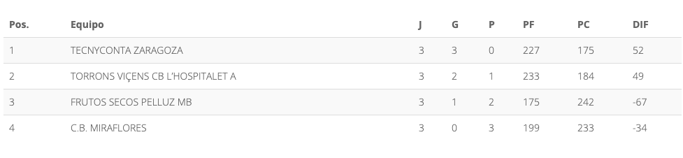 | Grupo D: FRUTOS SECOS PELLUZ 76-73 C.B. MIRAFLORES BASKET ZARAGOZA 72-62 C.B. L´HOSPITALET |