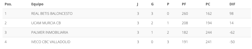 Grupo F: REAL BETIS BALONCESTO 90-61 IVECO CBC VALLADOLID PALMER INMOBILIARIA 58-80 UCAM MURCIA |