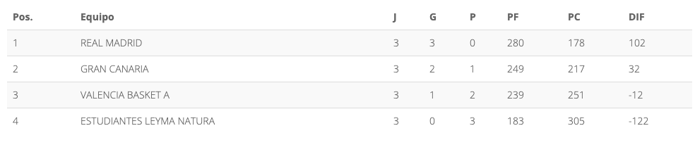 | Grupo A: VALENCIA BASKET 106-71 ESTUDIANTES LEYMA NATURA REAL MADRID 86-64 GRAN CANARIA | – – |