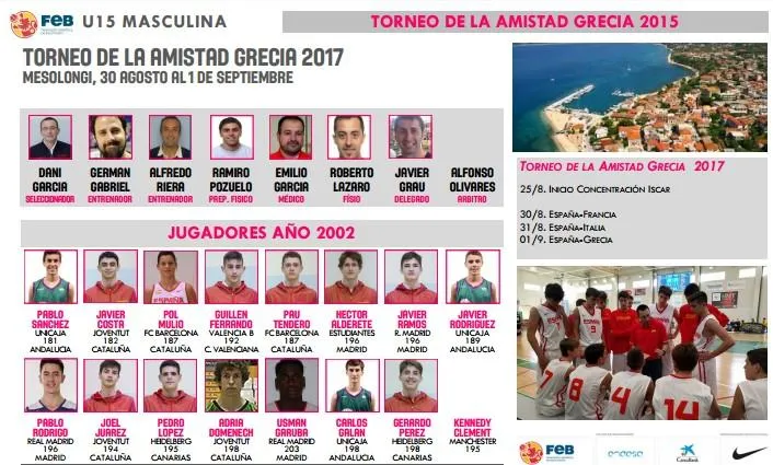 El verano previo a su debut en campeonatos oficiales de la FIBA, la generación del 2002 disputará el tradicional Torneo de la Amistad que enfrenta a cuatro países mediterráneos como España, Grecia, Italia y Francia y este año tendrá lugar en la localidad de Mesolongi (Grecia) del 30 de agosto al 1 de septiembre.