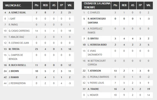 Y en el otro partido disputado este viernes, Valencia Basket venció a Ciudad de la Laguna Tenerife, también con porcentajes de acierto bajos y ritmo lento. Las ‘taronja’ fueron las que mejor arrancaron en el partido, aunque no con mucha diferencia ante su rival, que apenas fue capaz de anotar once puntos en el primer cuarto. En el segundo cuarto, Valencia Basket se atascó y esto permitió que Clarinos entrara en el partido, aunque las primeras seguían por delante en el marcador.