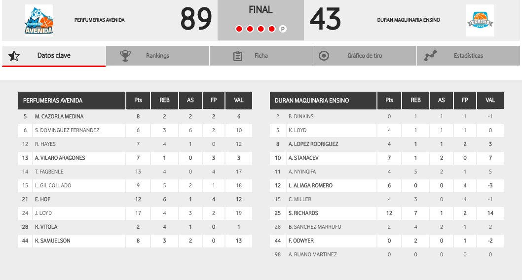 El último cuarto fue un reflejo del resto del partido. Perfumerías Avenida aprovechó para innovar en su rotación y Ensino Lugo para recortar la enorme ventaja impuesta durante el encuentro. Finalmente, el resultado de 89-43 fue el resultado del partido.