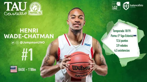 - Tras anunciar esta terna de renovaciones, TAU Castelló lanza el primer gran fichaje de la temporada en LEB Oro, Henri Wade-Chatman (26 años, 1.88m) regresa a la liga desde la liega de Estonia, donde la pasada temporada compitió en el Parnu firmando 12.6 puntos, 3.9 rebotes y 4.5 asistencias. El base norteamericano ya compitió en España en el CBC Valladolid, con el que ascendió a LEB Oro en 2017 y también continúo la 2017-18 en LEB Oro en el conjunto pucelano. El siguiente en anunciar su renovación podría ser el pívot Edu Gatell.