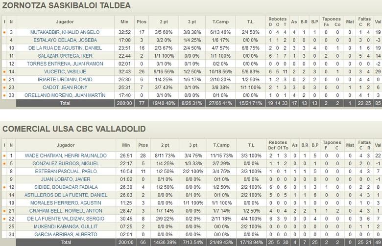 La férrea defensa del equipo de Amorebieta sobre Sergio de la Fuente (8 Pts, 9 Reb, 7 Val) ha vuelto a dejar al bravo ala-pívot vallisoletano lejos de los números que acostumbra a firmar, en su lugar, Wade-Chatman, (28 Pts, 3 Reb, 22 Val) ha tomado las riendas de los suyos echándose el equipo a la espalda en los momentos complicados. Pero sin aportación de hombres como Sidibe o Astilleros y con Vucetic campando a sus anchas por ambas pinturas, es muy difícil sacar nada en positivo. Como dato a tener en cuenta, las 25 pérdidas de balón de los de Paco García, demasiada ventaja para un rival que ha sabido aprovechar todos los regalos de los que ha dispuesto.