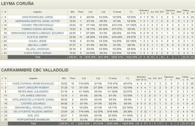 PLAYGROUND. En este duelo de desaciertos, dos jugadores pescaban en aguas revueltas. Henri Wade-Chatman imponía su juego de playground y sus penetraciones resultaban, por momentos, imparables para la defensa local, mientras que Sergio de la Fuente (internacional con la selección española de 3×3) desquiciaba a sus rivales con sus “trucos” y su habilidad para utilizar su cuerpo en las proximidades de la zona. Entre el estadounidense y el vitoriano sumaron 38 puntos y nada menos que 35 de los 49 créditos de valoración total que sumó el Carramimbre CBC Valladolid. El Leyma Coruña, por su parte, no encontró a un referente en su juego que liderase su ofensiva.
