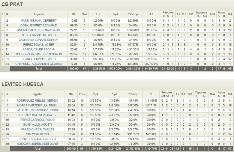 PRAT ABRE HUECO, HUESCA AGUANTA Tras la pausa, una buena salida de Prat hacía endosar un 7-2 que aumentaba la renta hasta los 10 puntos (38-28 a falta de 7:39). Andriuskevicius (15p, 13r) se convertía en referencia interior de CB Prat. Lejos de rendirse, Levitec remaba de nuevo contra corriente y con un buen trabajo de bloque lograba empatar el partido a falta de 2:49 con 5 puntos consecutivos de Mikel Motos (44-44). No obstante, Prat tomaba de nuevo las riendas en el electrónico y un palmeo de Martí dejaba las cosas en el 53-49 al final del tercer parcial.
