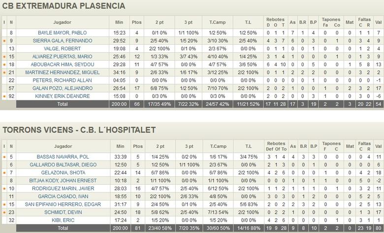 Los mejores del encuentro fueron, por parte del Extremadura Plasencia, Alejandro Galán (17p 2r) y por parte de Torrons Vicens – C.B. L´Hospitalet Shota Gelazonia (14p 6r).