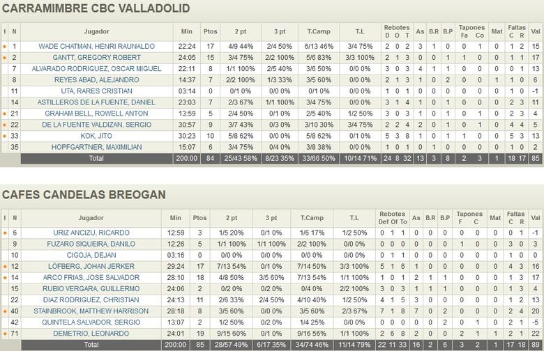 CARRAMIMBRE SE QUEDA A UN PUNTO DE TOCAR LA GLORIA Gran partido el que hemos disfrutado en la tarde de hoy en Valladolid y que se ha decidido por tan solo un punto de diferencia (84-85) en favor del equipo visitante. En el partido, correspondiente al aplazamiento de la primera jornada, medían sus fuerzas en la cancha de Pisuerga, por un lado, un Carramimbre Ciudad de Valladolid, que venía de conseguir sendos triunfos frente a Coruña y Oviedo y parecía volver a la senda de buen juego mostrada en el comienzo de la temporada, y por otro, el Cafés Candelas Breogán, invicto este curso y máximo aspirante a todo en esta LEB Oro.