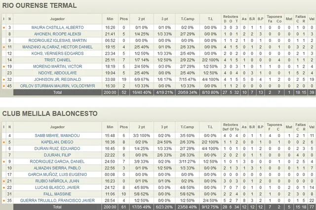 OURENSE NO PUDO REMONTAR Este fue el primer y verdadero momento de reacción ourensana, pues tras cinco puntos de Kohs, el Rio Ourense Termal se puso a seis y con posesión para atacar. Erró, y Edu Durán castigó con un triple que de nuevo elevaba la diferencia a favor de Melilla. Trist volvió a responder desde el exterior, pero en los siguientes minutos unos acertados Djuran y Samb anotaban y prácticamente finiquitaban el partido (42-54, min. 34). Lo intentó Ourense liderado por Johnson y Ahonen, pero no logró más que el intercambio de canastas, y cuando redujo la distancia a siete puntos, apenas quedaba medio minuto en el marcador, por lo que la victoria era imposible. Al final, 52-61 y próximo partido en Castellón, donde recibiremos a un equipo local en racha positiva mientras nosotros sumamos tan solo, de momento, una victoria en las primeras once jornadas ligueras.