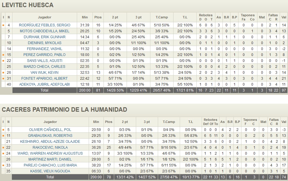 LOS PIVOTS, a pesar de que el partido ha tenido un gran acierto desde la línea de tres, Huesca ha rozado el 50% y Cáceres incluso lo ha superado, la clave ha estado en la posición de pivot. Por un lado al inicio la buena defensa sobre Grabauskas. Ya en la segunda parte y cuando el lituano mejor estaba, su quinta falta dejaba a Fontet como dueño de los rebotes, consiguiendo dos ofensivos que serán clave para la victoria final de los oscenses.