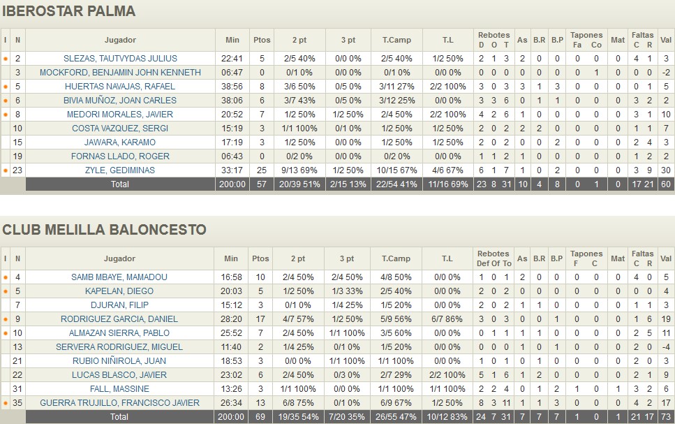 RODILLO DE MELILLA HASTA EL DESCANSO Hubo un partido antes y después del descanso de 15 minutos. Hasta el medio tiempo Melilla parecía un equipo muy superior a Palma. Dos canastas de Zyle y otras tantas de Bivià ponían el 8-4 en el luminoso y ahí empezó la habitual pájara local. Una serie de minutos en los que sólo una afortunada canasta de Medori dejaba un parcial 2-11 para abrir primeras diferencias (10-15) y la mala selección de tiro local y la dirección/anotación de Dani Rodríguez, el mejor de su equipo, ponían ya una diferencia de 8 al final del primer cuarto (15-23). Y el segundo período más de lo mismo, un nuevo parcial 2-11 y la máxima del partido para los melillenses (17-34) doblando en el marcador a su contrincante. La mejora palmesana vino únicamente desde el juego interior con Zyle y alguna chispa de Slezas para soportar a su equipo y mejorar en defensa, consiguiendo que las diferencias no aumentasen quedando la 2º parte del partido (27-43).