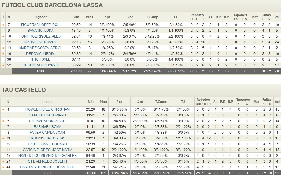 TAU COMO BLOQUE: El triunfo de los de Castelló se ha cimentado en diversos aspectos. Kyle Rowley ha llevado la batuta anotadora cerca de canasta con 18 puntos (8/10 en T2). Los rebotes han llevado la firma de Sabonis que con 12 (4 de ellos ofensivos) se ha mostrado intratable jugando de alero. Aegir Steinarsson se ha encargado de asistir a sus compañeros con 5 pases de canasta y Chema García con su selección de tiro y sus genialidades ha sentenciado el partido.