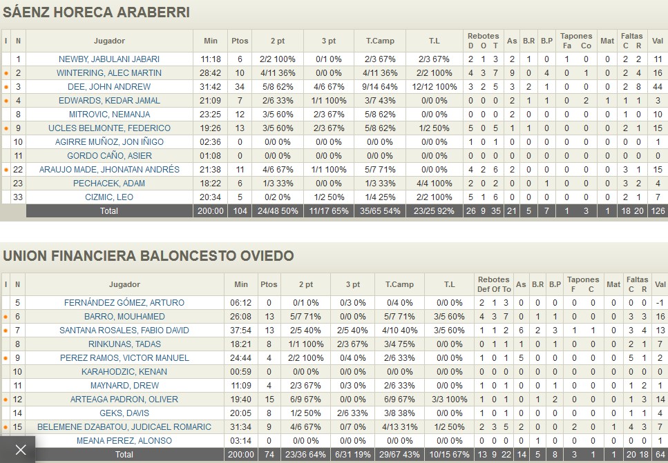 La gran sorpresa de la jornada. No tanto por la victoria local, sino por el resultado. Araberri cuajó un partido sensacional en ataque, en un día de esos en los que el balón parece una pelota de ping-pong y el aro una piscina. La exhibición total de Dee (34 puntos, 44 de valoración) fue fundamental para explicar la diferencia final entre ambos conjuntos. Finos en ataque y duros en defensa, los vascos maniataron a un Oviedo que aún se mantiene en los puestos de privilegio de la categoría. Barro y Arteaga dieron la cara por el cuadro astur, que sufrió de lo lindo en su visita al País Vasco.