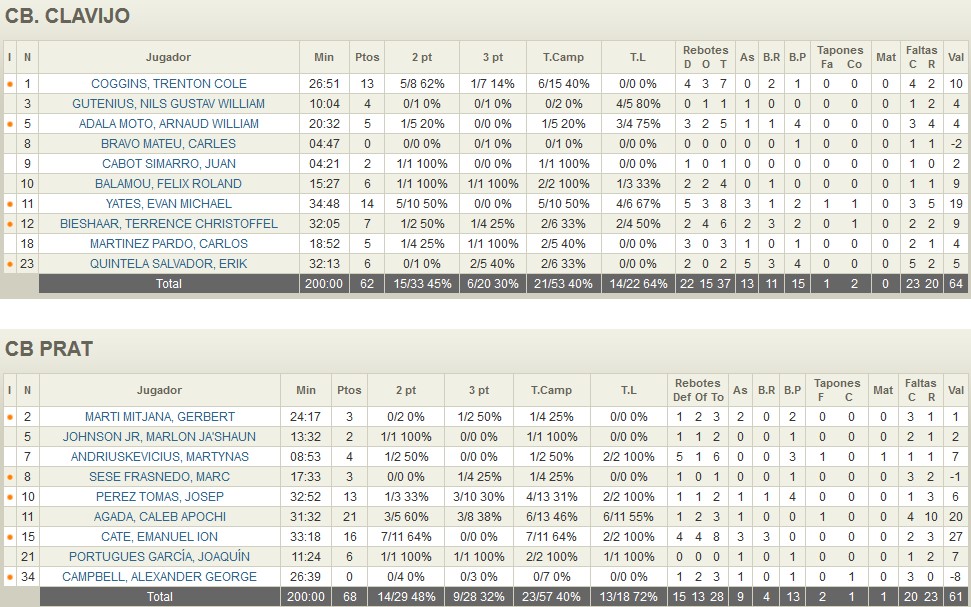 Y Prat reaccionó en La Rioja. Un impresionante parcial en el último cuarto (7-22) le dio la victoria al conjunto entrenado por Arturo Álvarez. Y es que los catalanes llegaron a los últimos diez minutos con el partido cuesta arriba, nueve abajo y con la sensación de irregularidad que han transmitido estas últimas semanas. Cate (27 de valoración) y Caleb Agada (21 puntos) lideraron la reacción visitante. Decimosexta victoria de la temporada para el conjunto visitante, que mantiene el pulso por el liderato con el Cafés Candelas Breogán. Evan Yates fue el mejor del cuadro riojano, con 14 puntos y 8 rebotes (19 de valoración).