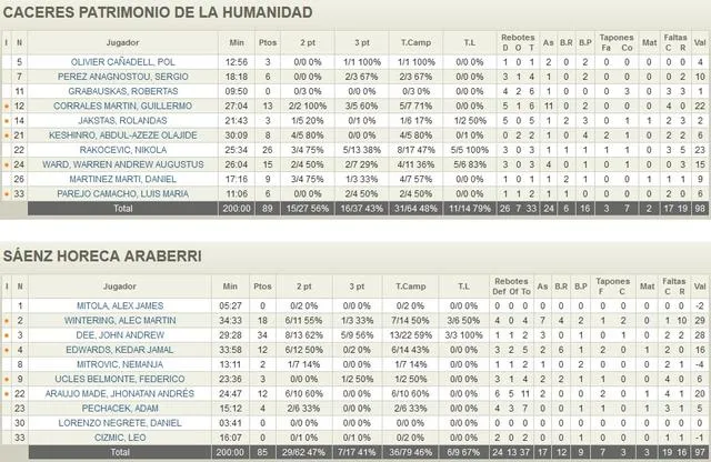 Victoria de Cáceres que le sirve para romper una racha de tres derrotas consecutivas y para seguir enganchado al grupo de equipos que mantiene cerca las posiciones de Playoff. El partido comenzaba con dominio de un Araberri que se imponía en el primer periodo 22-31. El resto de periodos acabaron con ventaja local. La pareja Wintering (18p, 4r, 7a)- Dee (34p, 3a) no fue suficiente para que el conjunto vitoriano pudiera sacar el triunfo en Cáceres. Rakocevic (26p) lideraba la anotación local y la buena dirección de Corrales (13p, 6r, 11a) fue decisiva para que la victoria del conjunto dirigido por Ñete Bohígas.
