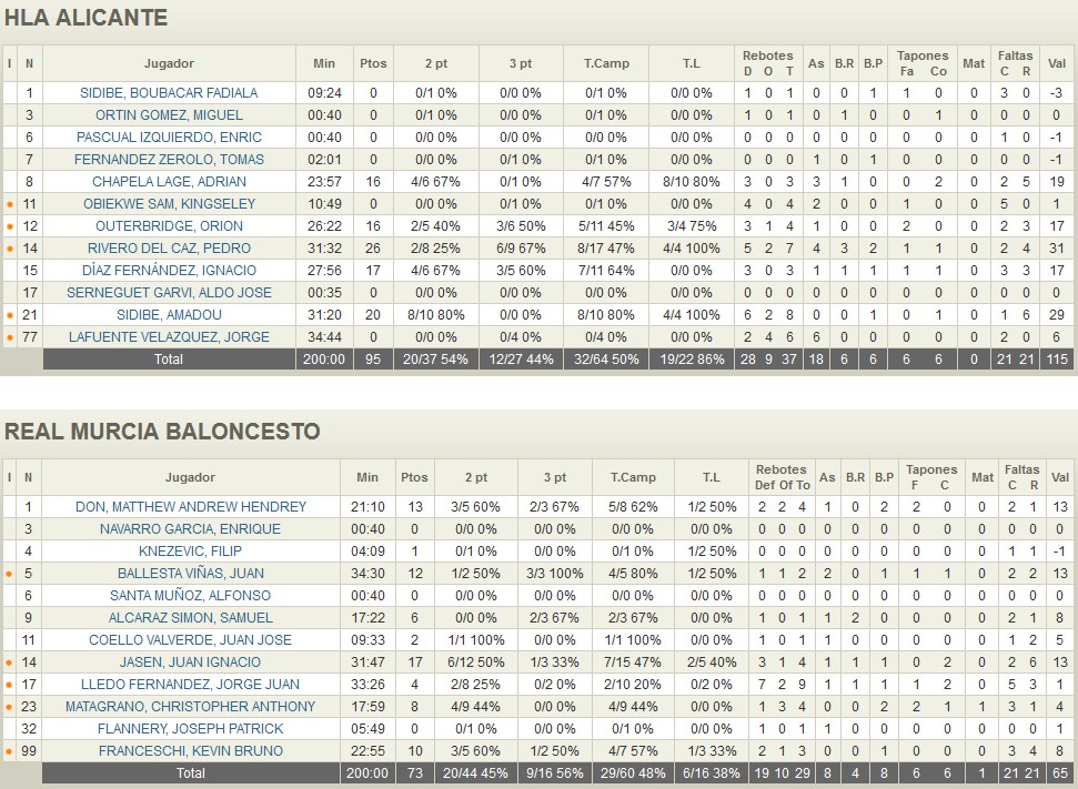 El equipo alicantino escala a la segunda plaza tras un partido en el que se reencontró con su mejor versión ante un Real Murcia que compitió y estuvo enganchado al partido hasta el tercer periodo. HLA Alicante jugaba con la presión de venir de tres derrotas seguidas en su cancha pero tuvo una buena puesta en escena y pronto se hizo con el dominio en el marcador. Rivero (26p, 7r) estuvo magistral en la dirección y efectivo desde el perímetro. Sidibe (20p, 8r) dominaba bajo el aro y Murcia tenía a Jasen (17p) como su jugador más efectivo. Los alicantinos ampliaba diferencias pero el acierto exterior de Ballesta en momentos puntuales impedía que el partido se rompiera. En el tramo final, los alicantinos abrieron ya una brecha que no se pudo frenar por parte de un Real Murcia que encadena su cuarta derrota consecutiva.