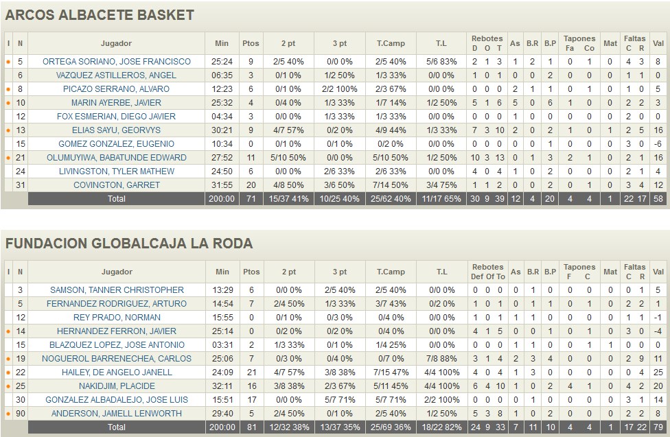Un 2+1 de Covington era contestado con otro triple de Chuso y dos libres de Noguerol que disparaba a La Roda a una máxima ventaja de +13 (68-81) a 35 segundos. Para llegar al final 71 a 81, donde La Roda se imponía con un absoluto control del juego en el último cuarto. Y un Chuso intratable desde el triple que se reivindicó ante su antiguo equipo. Aplaudir a la afición de La Roda porque hubo momentos que el Pabellón del Parque parecía el Lozano Jareño. No decepcionó en absoluto el primer derbi albaceteño de la historia de LEB Plata.