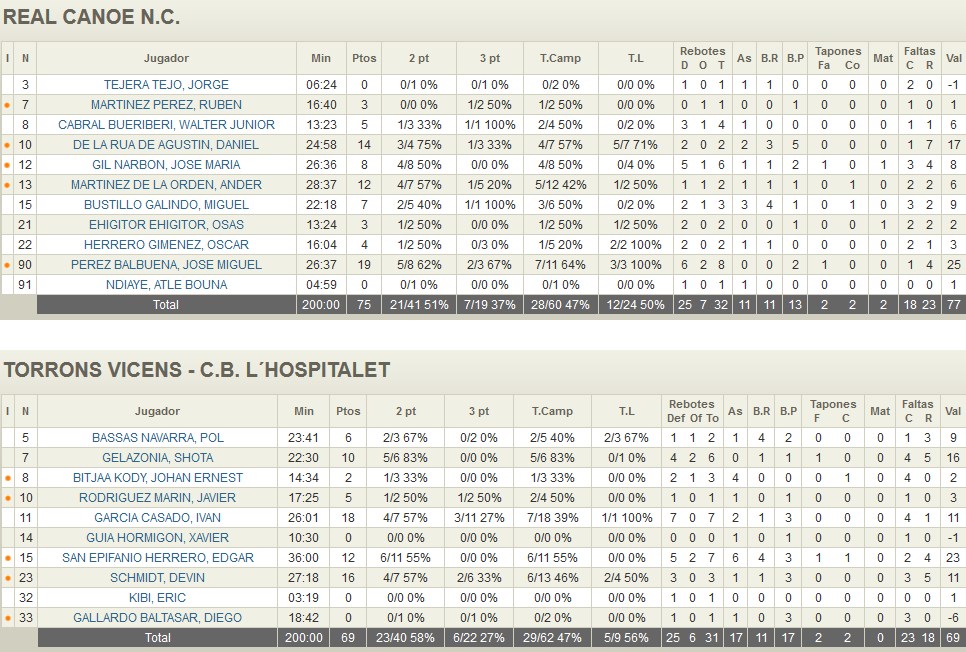 El Real Canoe puso fin a la triunfal racha de seis triunfos consecutivos con las que CB L'Hospitalet se presentaba en Madrid. Los locales consiguieron remontar un partido que se les complicó en la primera parte (28-38) y acabar sellando un triunfo que les mantiene en zona de lucha por puestos de Playoff. Hospitalet deja escapar con esta derrota ciertas opciones de disputar la Copa LEB Plata. Tyson Pérez (19p, 8r) fue el mejor hombre de un Canoe en el que emergió la figura de De la Rua (14p, 7 faltas recibidas) firmando una de sus mejores actuaciones de la temporada. San Epifanio (12p, 7r, 6a) firmó un partido completo y estuvo secundado por Gelazonia (10p, 6r) y Schmidt (16p) pero no fueron suficientes argumentos para lograr el triunfo
