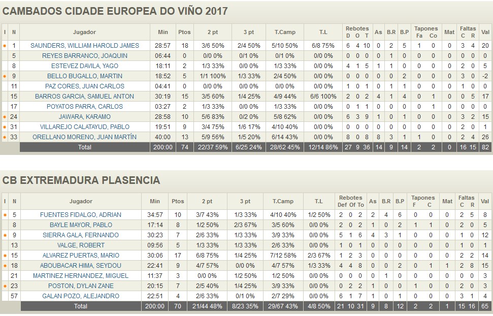 Cambados y Plasencia reprodujeron en la pista toda la igualdad mostrada en tabla y ofrecieron un emocionante partido no exento de errores pero jugado sin tregua, que se decidió en los últimos segundos de lado local (74-70) pero que pudo acabar para los intereses placentinos.