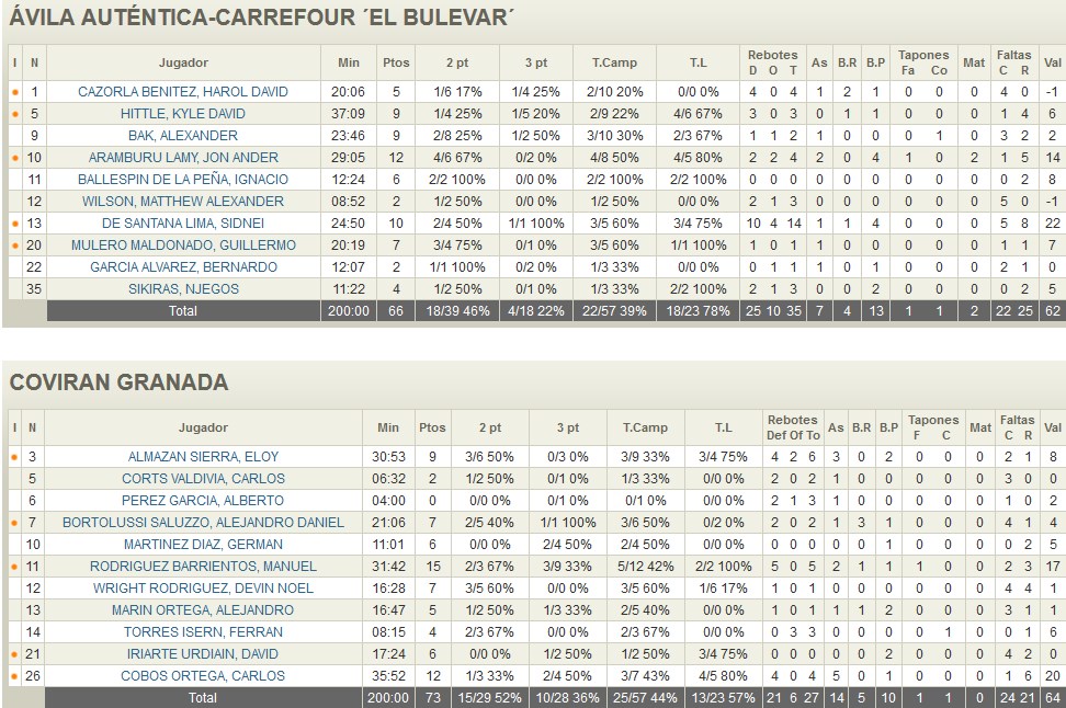 Trabajada victoria de Granada en su visita al CUM Carlos Sastre. Partido que arrancaba con claro dominio granadino en un primer periodo donde los locales estuvieron atascados en ataque (7-27). Pero los de Sergio Jiménez se rehicieron y se presentaron al comienzo del último periodo en partido (55-58), sin embargo en el momento decisivo fue Granada el que resolvió mejor. De Cobos (12p, 5a) y Manu Rodríguez (15p, 5r) fueron los mejores de Granada mientras que Santana (10p, 14r) lideró a un Ávila que dominó el rebote pero no acabó sellando la remontada realizada. Granada se queda como líder en solitario y tiene casi asegurada la disputa de la Copa LEB Plata mientras que Ávila encadena dos derrotas que le han alejado de la zona alta.