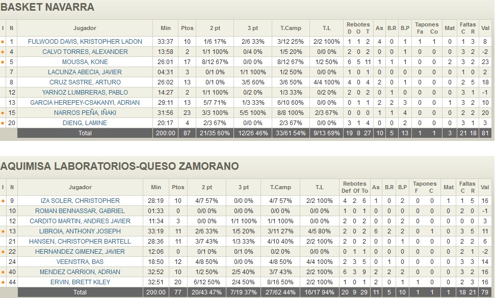 Era el momento de los jugones, y ahí apareció Narros para sumar siete puntos, y también Cruz con un triple y dos tiros libres que contrarrestaban los tres triples, de Hansen, Mendez y otro de Ervin, un dolor de cabeza para Navarra toda la noche con 20 puntos, para volver a poner el +10 en el marcador, ventaja que los tiros libres finales certificaron y permitieron a Navarra subir puestos en la clasificación con la tercera victoria consecutiva.