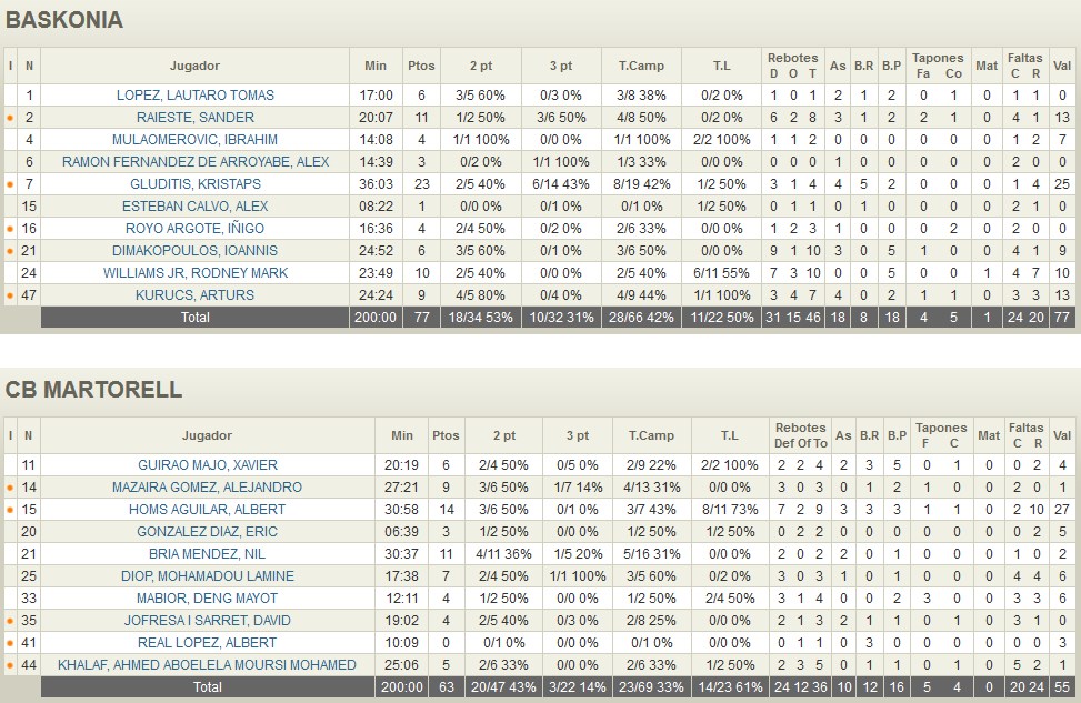 El filial baskonista se llevó el duelo entre dos de los equipos que ocupan puestos de descenso. Los locales dominaron el partido desde el arranque. Al descanso ya mandaban 46-26 y durante la segunda mitad pudieron gestionar las rentas sin demasiados problemas. Gluditis (23p, 4r) fue el mejor de lo locales donde Williams (10p, 10r) volvió a dar señales de que puede ser una pieza iimportante en el equipo. Por parte de Martorell, Albert Homs (14p, 9r, 10 faltas recibidas) fue el jugador más destacado pero no fue suficiente para dar el triunfo a un conjunto catalán desacertado desde el perímetro.