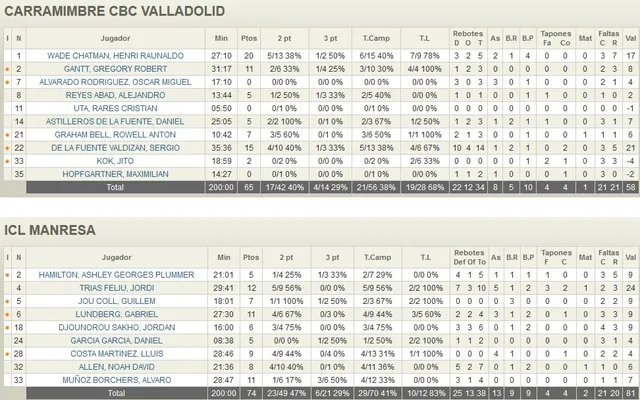 PRIMERA PARTE SIN TIRO EXTERIOR Ninguno de los dos equipos estuvo acertado de la línea del 6,75 en la primera parte. Los de Paco García certificaban un 1/10 desde el perímetro pero, sin duda alguna, el dato más llamativo fue el 1/10 del equipo visitante. Factor clave para que la renta favorable a ICL Manresa en el descanso fuese de tan solo de 5 puntos (29-34). En las filas vallisoletanas tan solo Wade Chatman estuvo en posición “ON” durante esta primera parte. Mientras, un Manresa bien capitaneado por el incombustible Jordi Trías, conseguía que todos los jugadores de los que disponía Aleix Durán sumasen algún punto en su casillero
