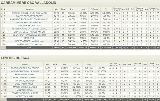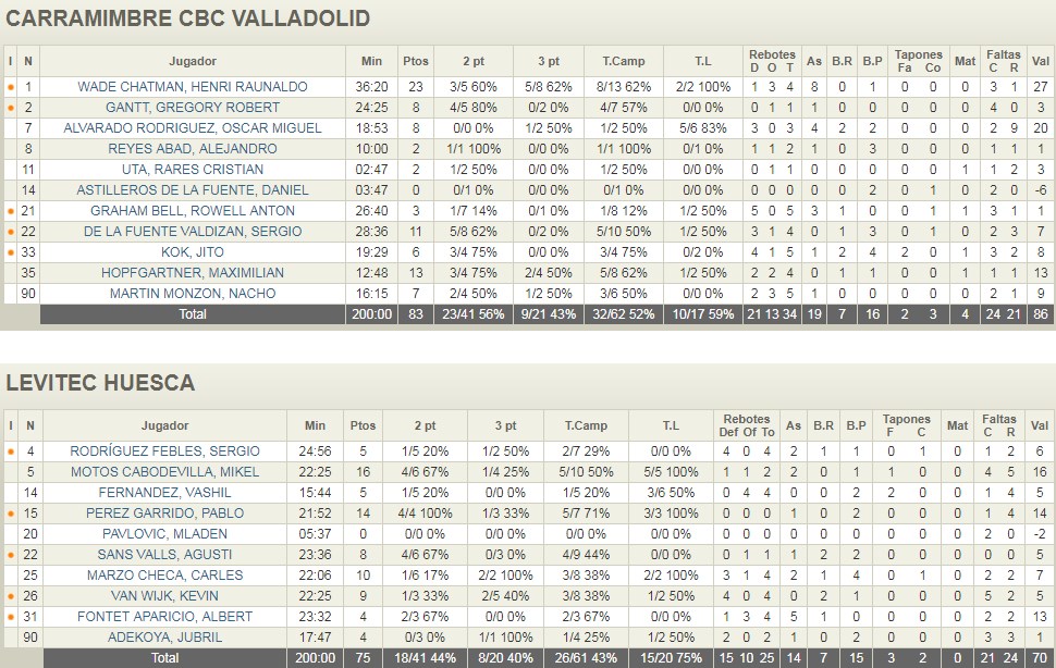 MVP. HENRI WADE CHATMAN Los dos bases vallisoletanos han jugado a un alto nivel. El americano brillando en la faceta anotadora (23 Pts, 4Reb, 27 Val) y el canario con una impecable dirección (8 Pts,3 Reb,9 faltas recibidas, 20 Val) Mikel Motos se convertía en el jugador más valorado en Levitec con 16 Pts, 2 Reb, 16 Val. Destacar los 7 Pts, 5 Reb, 9 Val con 16´15´´ jugados por Nacho Martín que han servido para que Carramimbre esté más cerca del objetivo de la salvación.