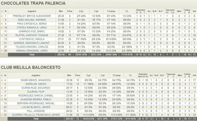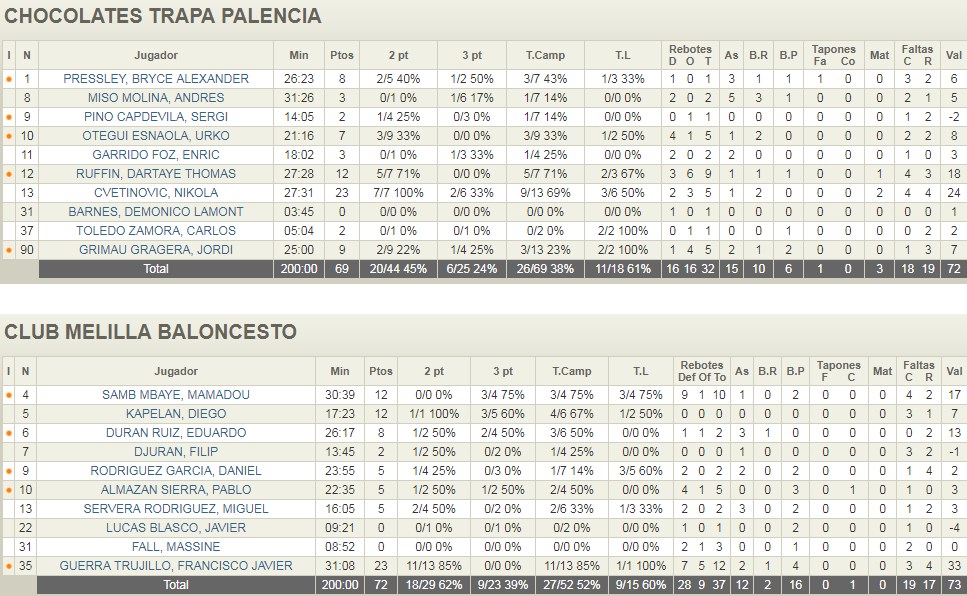 Dos clásicos de la competición, habituales en finales de Liga y Copa, disputaban un partido cuya victoria se antojaba fundamental para ambos. Salió mucho mejor el Melilla de Alejandro Alcoba, que llegó a poner el 10-24 al inicio del segundo cuarto con Fran Guerra haciendo mucho daño y con un Trapa Palencia muy desacertado desde el exterior. Los de Joaquín Prado fueron reduciendo poco a poco la diferencia, con Nikola Cvetinovic como máximo anotador. Precisamente dos canastas suyas ponían el 57-56 para terminar de culminar la remontada castellana, pero esta temporada el Chocolates Trapa está mostrando un juego muy irregular y los últimos minutos de juego fueron para un Melilla Baloncesto que jugó con mayor inteligencia. Dani Rodríguez anotó los dos tiros libres a falta de 10 segundos y el triple de Andrés Miso que hubiera llevado a la prórroga, no llegó al aro rival. Victoria número 12 para los de Melilla y segunda derrota consecutiva de los locales que salen de puestos de playoffs.